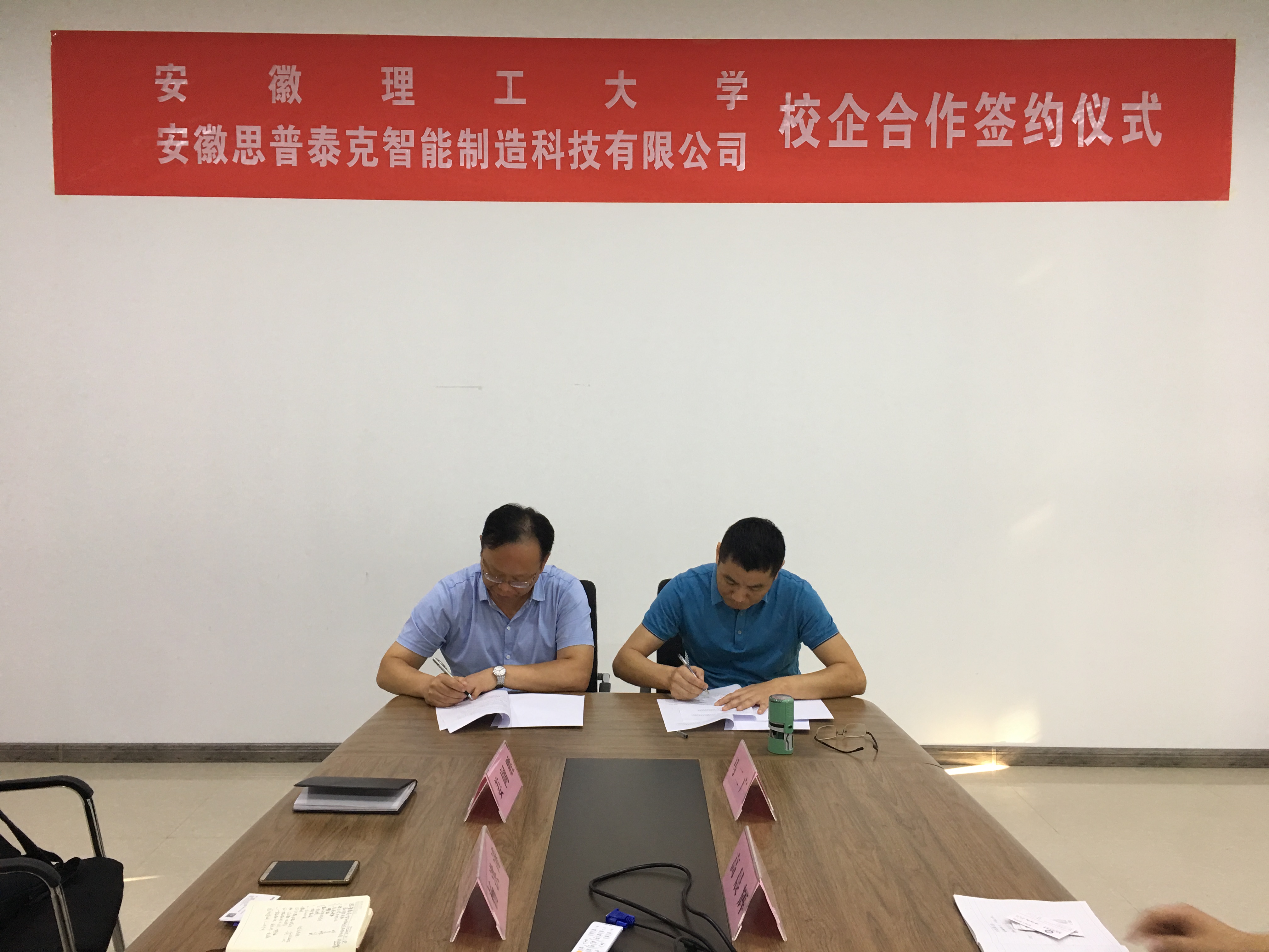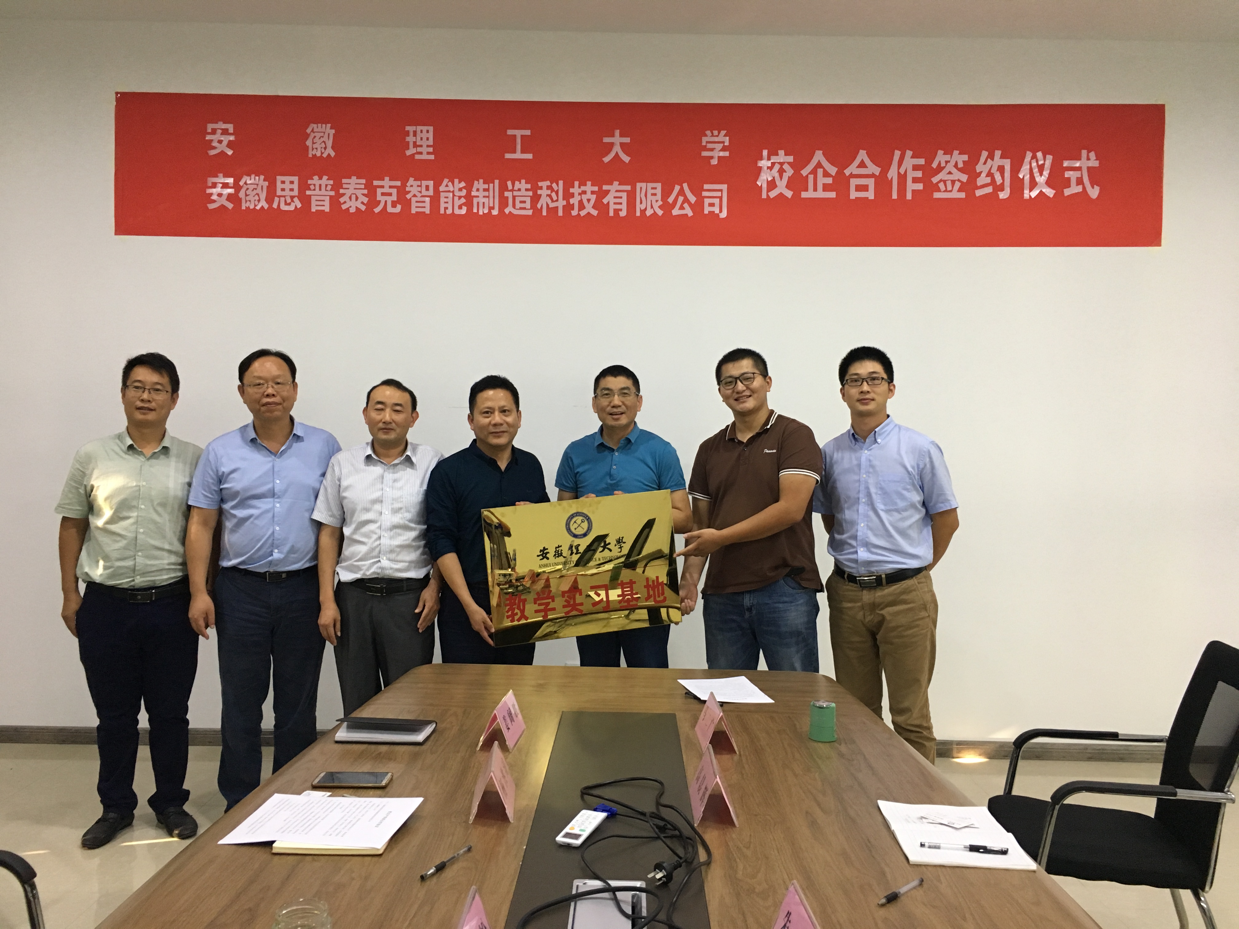 校企產(chǎn)學(xué)研簽約合影 2019年9月18日,在這個特殊的日子里,安徽思普泰克智能制造科技有限公司與安徽理工大學(xué)簽署產(chǎn)學(xué)研戰(zhàn)略合作協(xié)議。安徽理工大學(xué)機(jī)械工程學(xué)院副院長楊洪濤教授